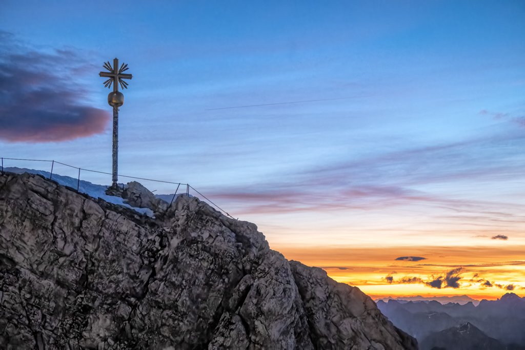 Diese Aufnahme im 3:2-Format zeigt das markante Gipfelkreuz der Zugspitze. Während das Kreuz und der tragende Fels im Vordergrund noch im Schatten liegen, öffnet sich nach rechts der Blick auf einen intensiv orange-gelb leuchtenden Horizont.