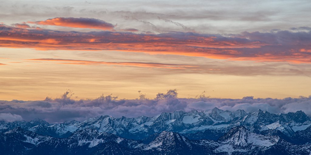 Dieses Motiv fängt eine besondere Wetterstimmung über den Alpengipfeln ein. Während die schneebedeckten Flanken der Berge im Schatten liegen, werden die langgezogenen Wolkenbänder am oberen Bildrand von der Morgensonne intensiv illuminiert. Zwischen den Gipfeln und den hellen Wolken sorgt eine Schicht aus violetten Dunstschleiern für zusätzliche Tiefe in der Komposition.