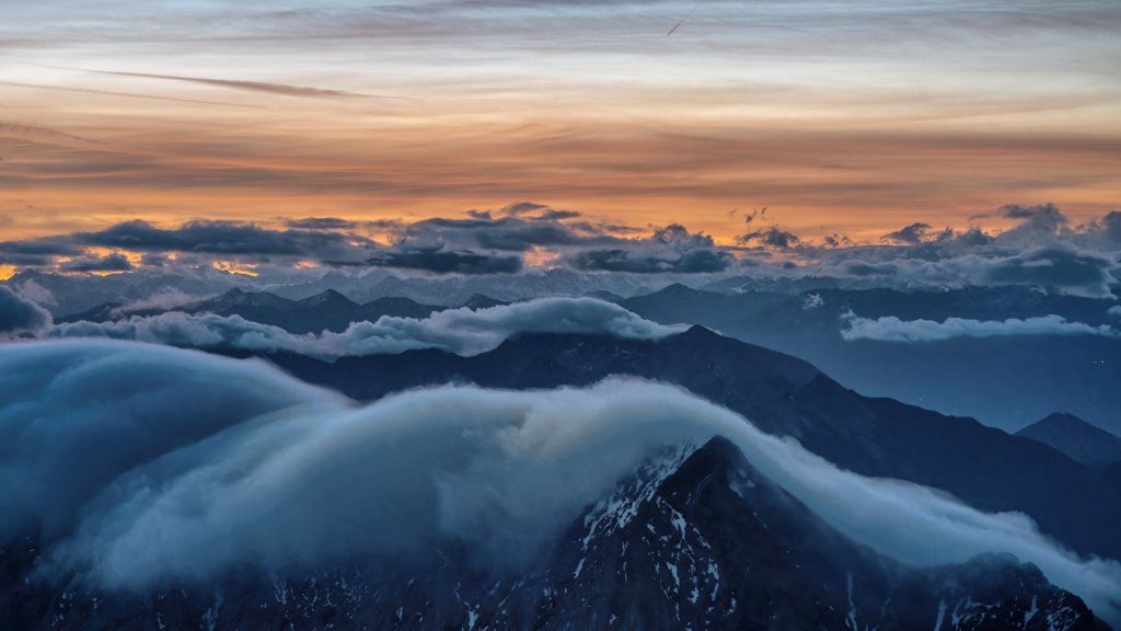 Motiv: Wolkenwellen über Berggipfeln in der Morgendämmerung.
