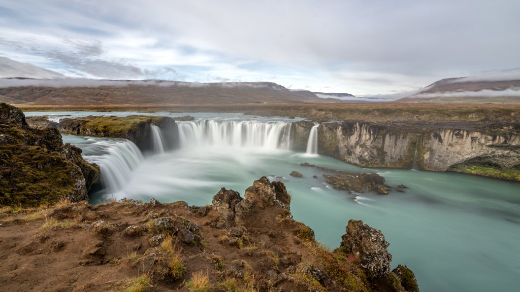 Holen Sie sich die göttliche Schönheit Islands in Ihre Räume. Das Wandbild „Goðafoss“ im weiten 16:9 Panorama-Format zeigt den „Wasserfall der Götter“ in einer faszinierenden Langzeitbelichtung. Das milchig-türkisfarbene Wasser, das sich hufeisenförmig über die dunklen Basaltfelsen ergießt, schafft eine Atmosphäre von zeitloser Eleganz und tiefer Ruhe.