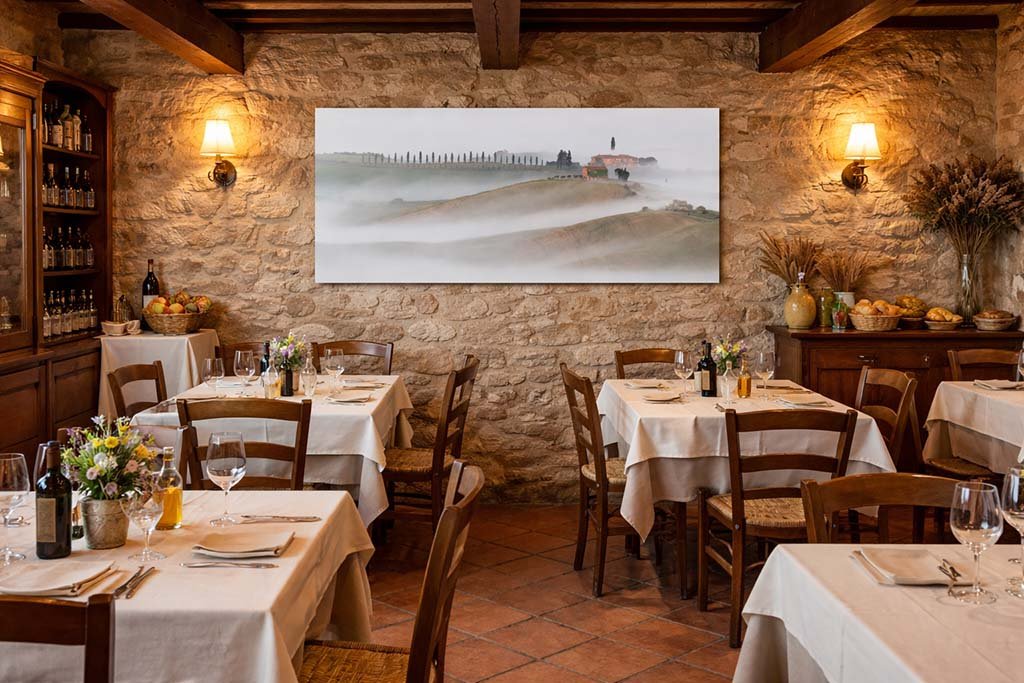 Diese harmonische Komposition wirkt beruhigend und gleichzeitig inspirierend. Besonders in einem italienischen Restaurant oder in großzügigen Räumen mit mediterranem Flair setzt dieses Panorama einen edlen Akzent, der den Blick in die Ferne schweifen lässt. Ein exklusives Werk, das die Sehnsucht nach dem „Dolce Vita“ und der unberührten Schönheit der toskanischen Landschaft in Ihr Ambiente bringt.
