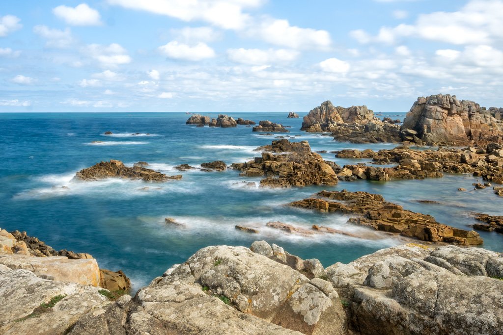 • Motiv: Schroffe Küstenfelsen der Bretagne mit Langzeitbelichtung des Meeres.