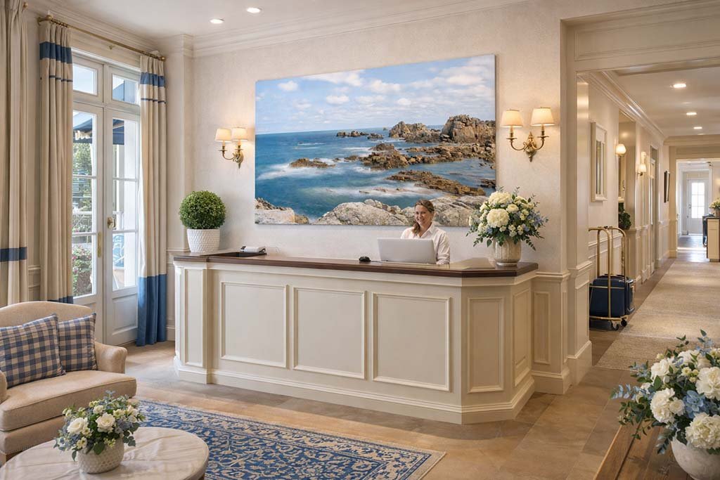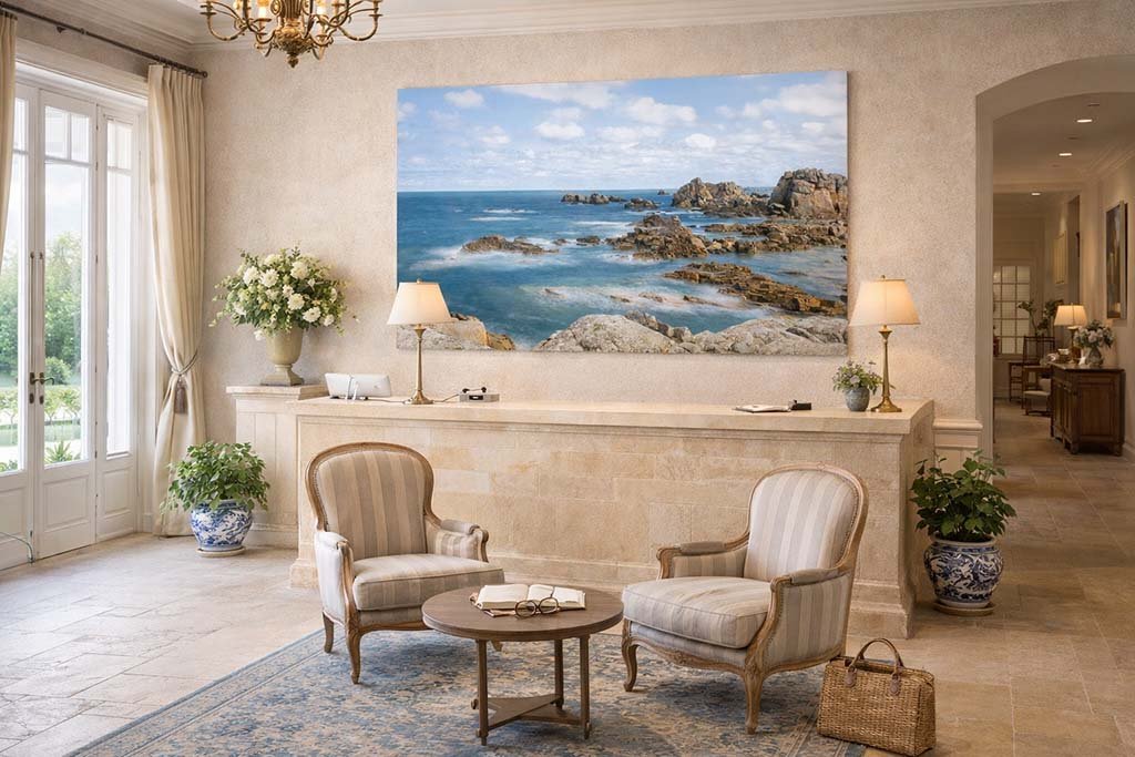 Die weichen, nebelartigen Wasserläufe zwischen den Felsen verleihen dem Bild eine traumhafte, beinahe malerische Qualität. Diese ausgleichende Ausstrahlung macht dieses Wandbild zur idealen Wahl für gehobene Ambiente – ob als beruhigender Blickfang in einem exklusiven Hotelzimmer oder als einladendes Element in einer Hotellobby. Ein meisterhaftes Stück Fotokunst, das die unberührte Ästhetik der französischen Küste in Ihr Zuhause oder Ihr geschäftliches Umfeld bringt.