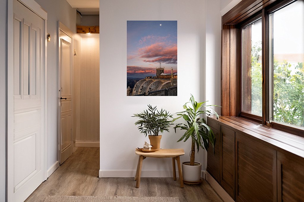 Die grafischen Linien der Geländer und der modernen Forschungsstation bilden einen spannenden Kontrast zur organischen Weichheit der rosa leuchtenden Wolken. Diese Ausstrahlung von technischer Präzision und kosmischer Ruhe macht das Wandbild „Der Mond über allem“ zu einem idealen Blickfang für moderne Büros, Flure oder Wohnbereiche, die eine vertikale Akzentuierung benötigen. Ein exklusives Stück Fotokunst, das die Faszination der Hochgebirgswelt bei Tagesanbruch festhält.