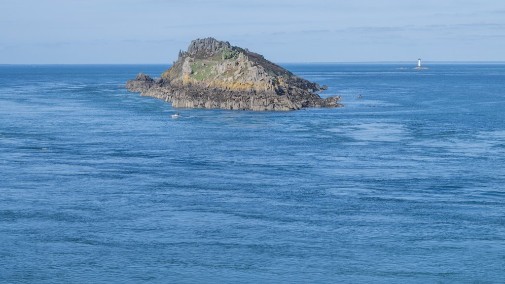 Motiv: Felseninsel im offenen Meer mit Leuchtturm im Hintergrund.