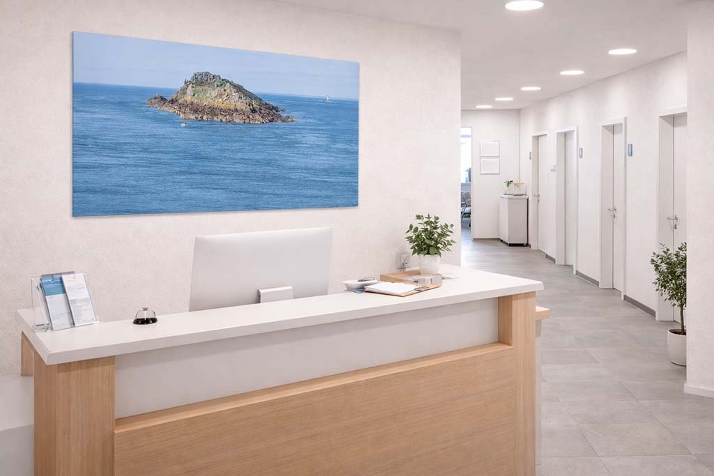 Die feinen Strukturen der Wellenbewegungen und die klare Sicht bis zum Horizont verleihen dem Raum eine spürbare Tiefe. Diese ausgleichende und souveräne Wirkung macht das Wandbild „Eine Insel im Meer“ zur idealen Wahl für repräsentative Bereiche – wie etwa den Empfangsbereich einer Arztpraxis oder einen modern gestalteten Büroraum. Ein exklusives Stück Fotokunst, das die Sehnsucht nach der Ferne und die Ruhe der Elemente perfekt in Ihr Ambiente integriert.