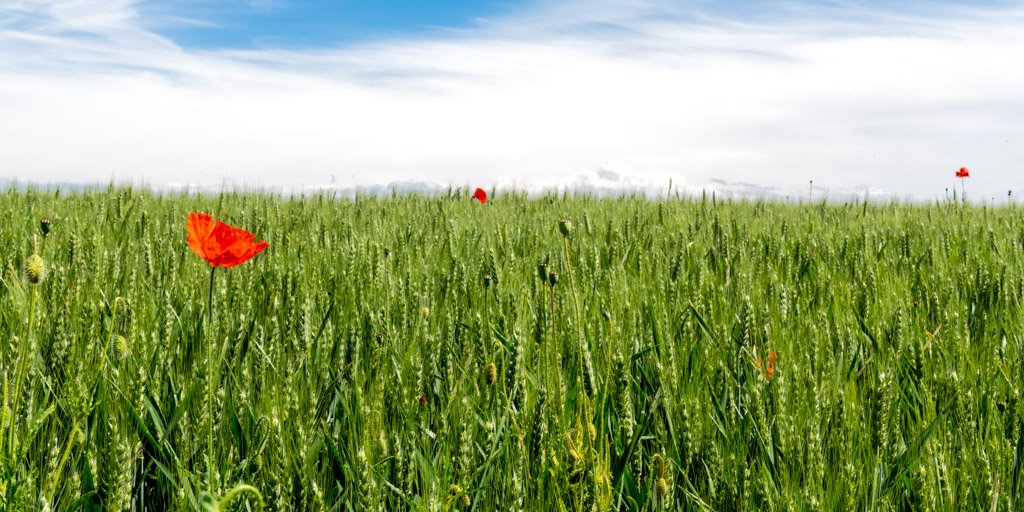 Motiv: Einzelne rote Mohnblüte im grünen Feld vor blau-weißem Himmel.