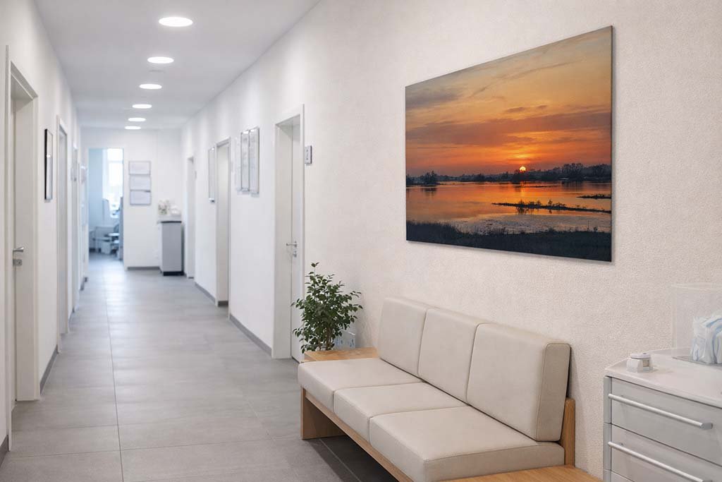 Die ruhige Linienführung des Ufers und die friedliche Stimmung der Flusslandschaft verleihen jedem Raum eine ausgleichende Note. Besonders an Orten, an denen eine beruhigende Wirkung erwünscht ist – wie in einem modernen Behandlungszimmer beim Zahnarzt oder im Schlafbereich –, entfaltet dieses Motiv seine volle Kraft. Ein exklusives Stück Fotokunst, das die zeitlose Schönheit der Natur im Abendlicht festhält.
