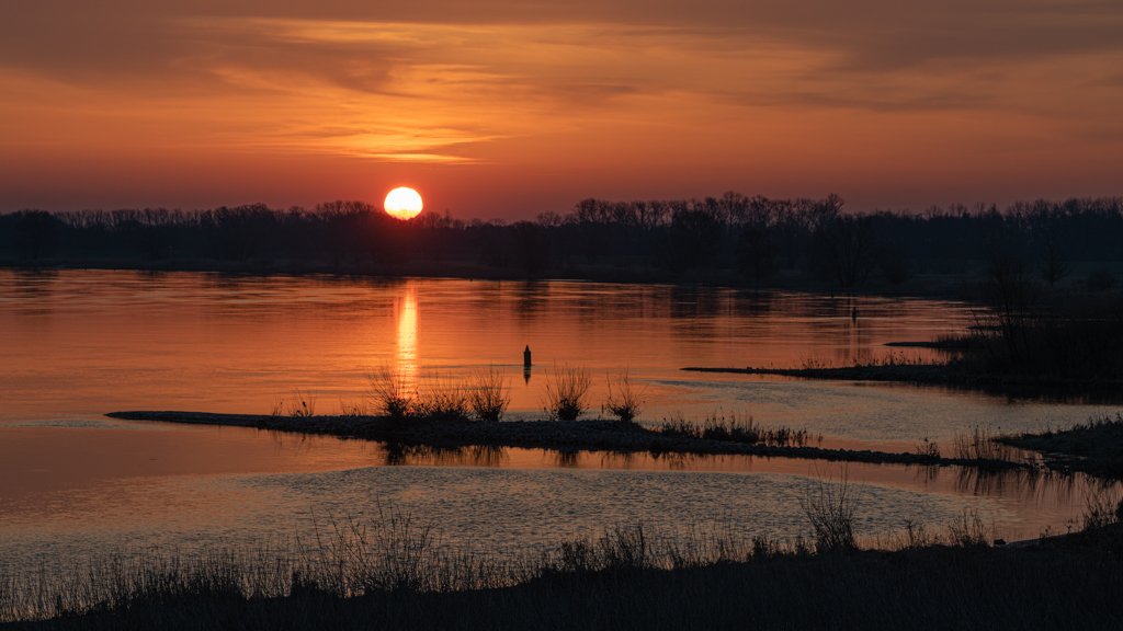Erleben Sie die pure Magie der Ruhe. Das Wandbild „Elbeufer Sonnenuntergang“ im weiten 16:9 Panorama-Format hält den ultimativen Moment fest, in dem die Sonne als brennender Ball den Horizont berührt. Die tiefrote Färbung des Himmels und die perfekte Spiegelung im stillen Wasser der Elbe schaffen eine Atmosphäre von unvergleichlicher Wärme und Harmonie.