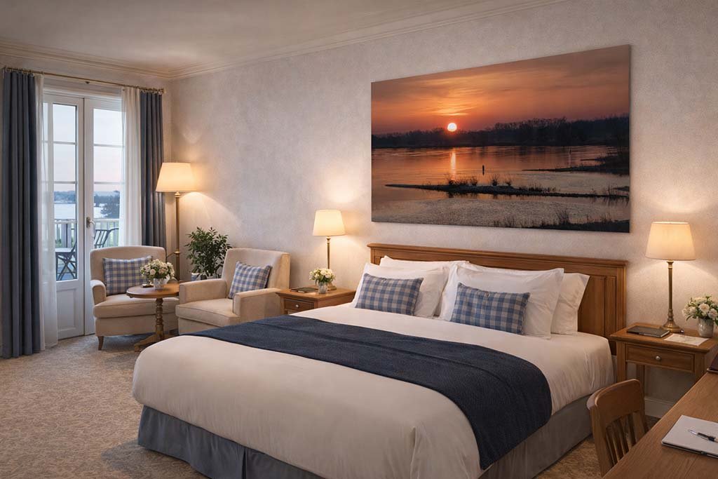 Die klare Symmetrie der Spiegelung und die intensiven Orange- und Rottöne verleihen dem Raum eine spürbare Behaglichkeit. Besonders in einem exklusiven Hotelzimmer oder einem privaten Rückzugsort wirkt dieses Panorama-Motiv als Fenster zu einem friedlichen Tagesausklang. Es lädt den Betrachter ein, den Alltag hinter sich zu lassen und in die stille Kraft des Elements Wasser einzutauchen. Ein meisterhaftes Werk der Fotokunst, das durch seine Schlichtheit und Brillanz überzeugt.