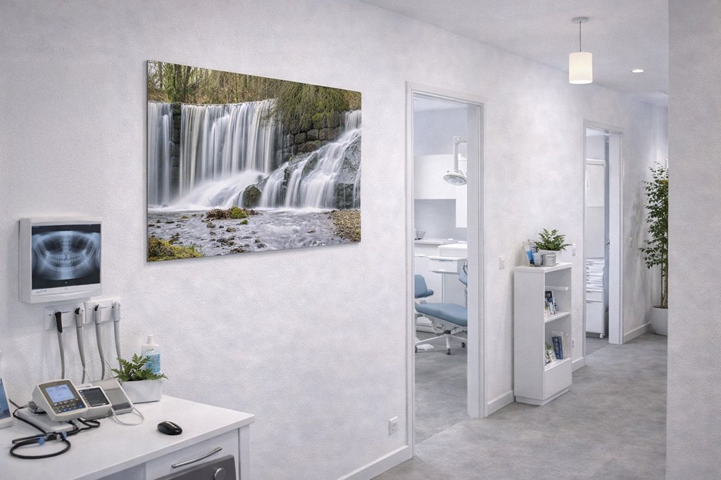 Die sanften Erdtöne der Felsen und das lebendige Moosgrün bilden einen harmonischen Rahmen für das strahlende Weiß der Wasserläufe. Diese ausgleichende Wirkung macht das Wandbild „Geratser Wasserfall“ zu einer idealen Wahl für Orte, an denen Wohlbefinden und Ruhe im Vordergrund stehen – sei es in einer modernen Arztpraxis, im Empfangsbereich oder im privaten Wohnraum. Ein Stück Heimatkunst, das die zeitlose Ästhetik fließenden Wassers perfekt zur Geltung bringt.