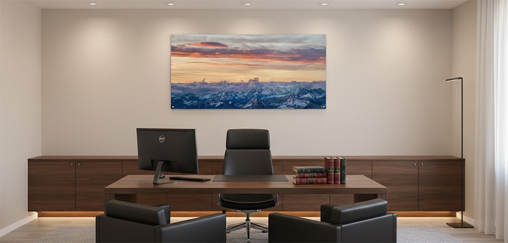 Blicken Sie über die Grenzen des Alltags hinaus. Das Wandbild „Gipfelwolken“ im Format 2:1 zeigt die majestätische Ruhe der Alpen am Morgen. Die sanften Farbübergänge des Himmels und die klare Zeichnung der fernen Bergrücken schaffen eine Atmosphäre von Weite und Gelassenheit in Ihren Räumen.