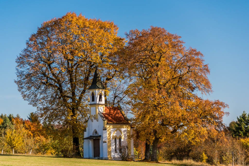 Motiv: Kapelle im Allgäu eingerahmt von herbstlichen Bäumen.