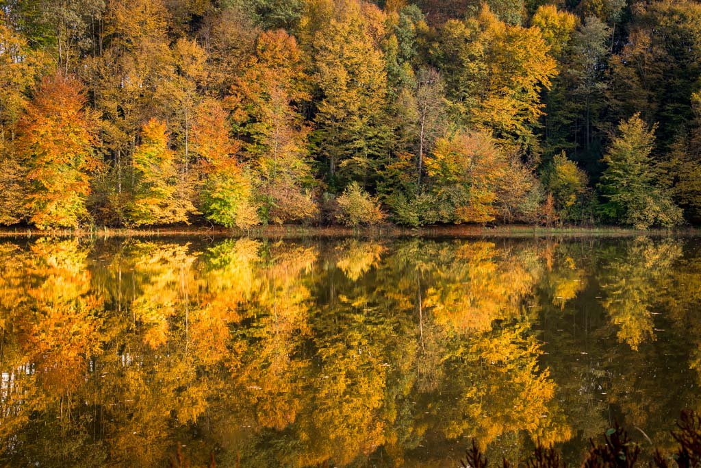 Motiv: Farbenfroher Herbstwald mit Spiegelung auf einem See.