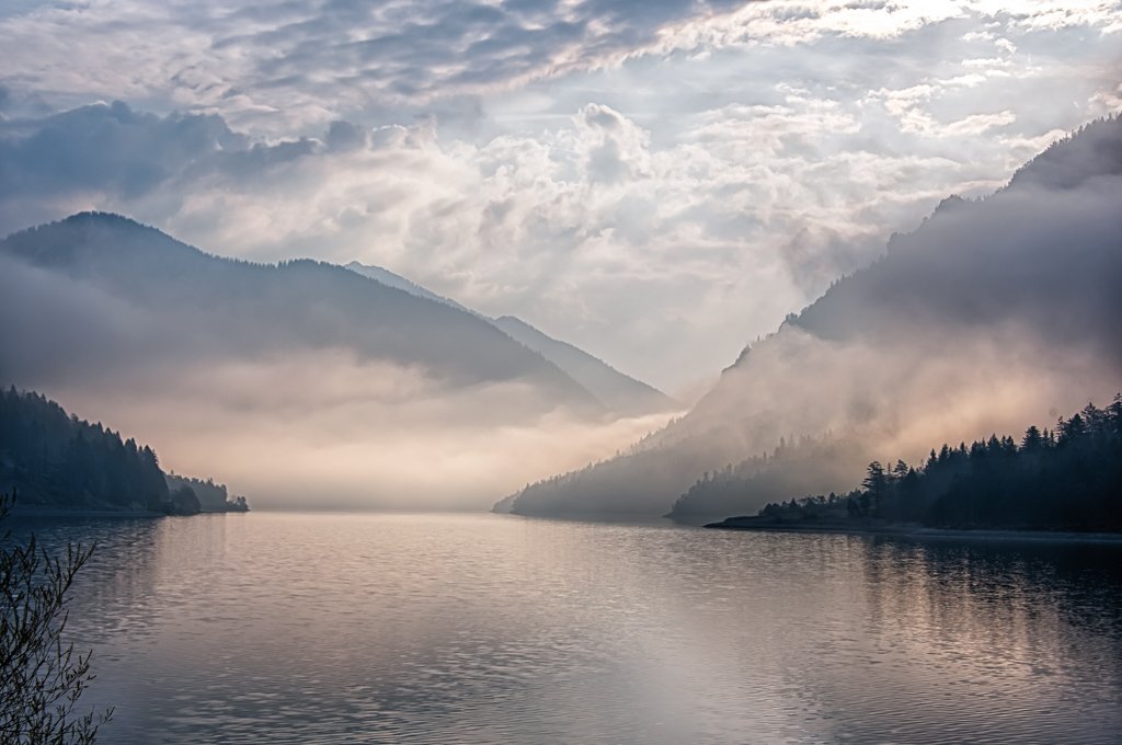 Motiv: Nebelstimmung am Plansee bei Sonnenaufgang.