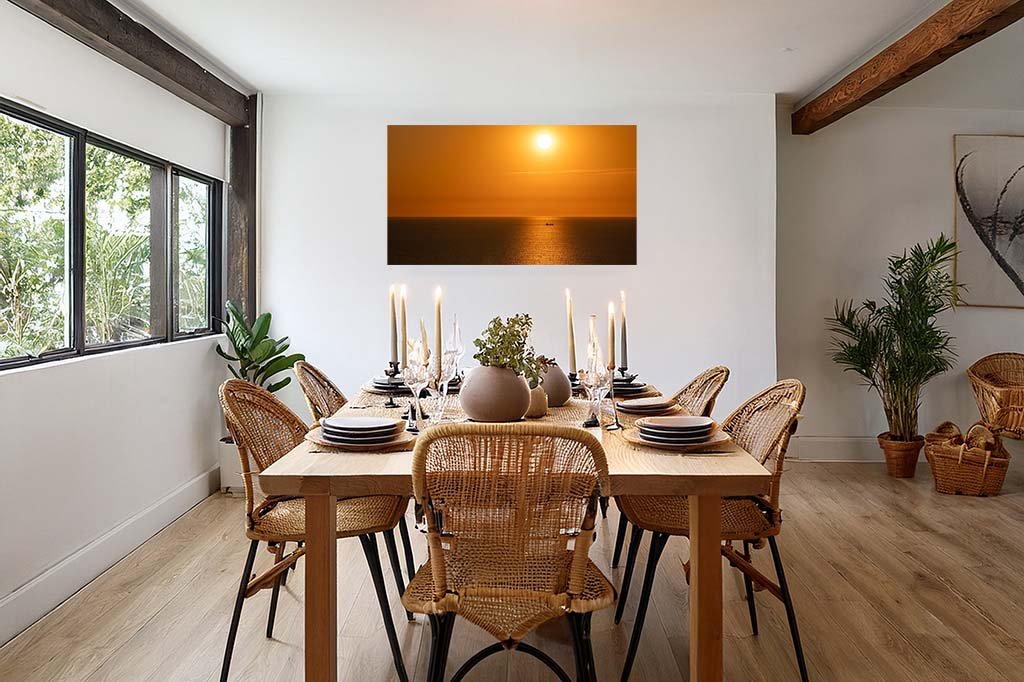 Goldene Stunden für Ihr Zuhause: Das Wandbild „In the Evening“ fängt die meditative Ruhe eines Sonnenuntergangs über dem Meer ein. Ein kraftvolles Werk im 16:9 Panoramaformat, das Wärme und Weite in Ihr Esszimmer bringt.