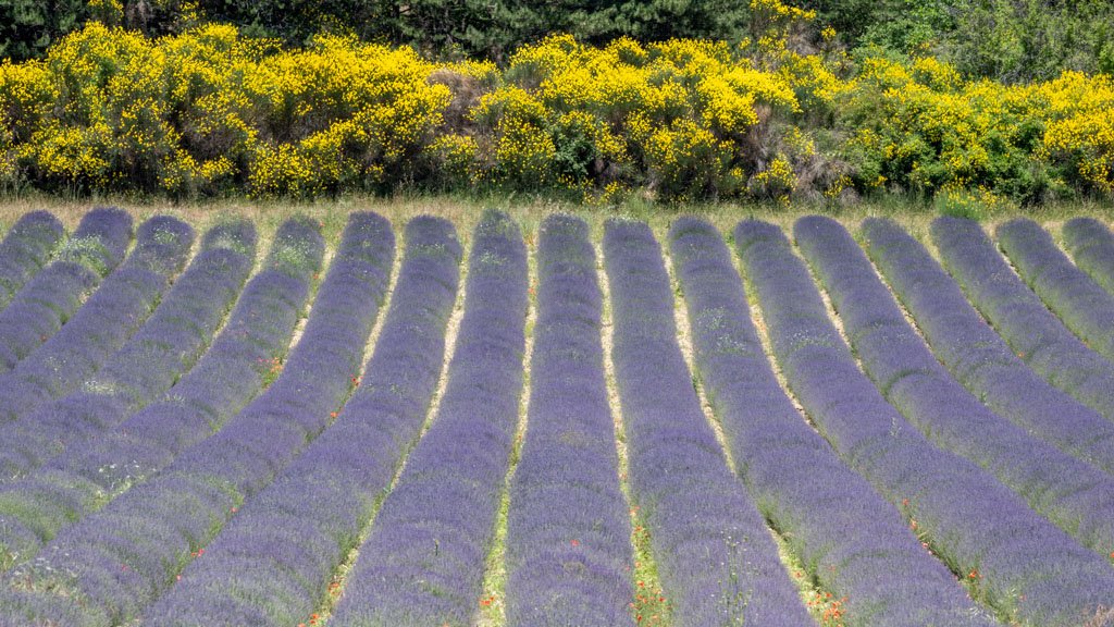 Dieses Werk ist eine Hommage an die Farbenpracht des Südens. Die Panorama-Aufnahme betont die Weite der Felder, in denen sich das tiefe Violett des Lavendels rhythmisch bis zu einer Reihe leuchtend gelber Ginsterbüsche erstreckt. Dieser natürliche Komplementärkontrast sorgt für eine besondere Dynamik im Bild und fängt die intensive Lichtstimmung eines Sommertages perfekt ein.