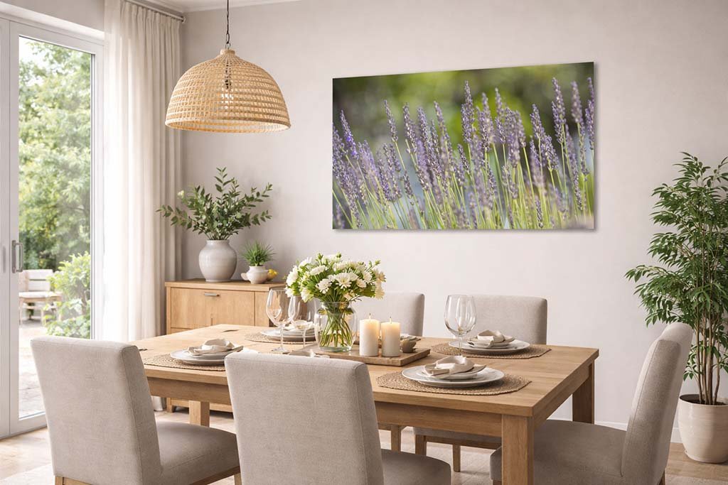 Besonders in einem Esszimmer sorgt „Lavendeldetail“ für ein freundliches und appetitliches Ambiente. Die natürlichen Farben wirken belebend und schaffen eine Gesprächsatmosphäre, die zum Verweilen einlädt. Die hochwertige Umsetzung auf Acrylglas oder Leinwand bringt die feinen Härchen und Nuancen der Blüten besonders gut zur Geltung. Auf Alu-Dibond überzeugt das Bild durch seine moderne, reflexionsfreie Oberfläche. Dieses Kunstwerk fängt den Sommer dauerhaft ein und bereichert Ihre Wand mit einem Stück lebendiger Natur.