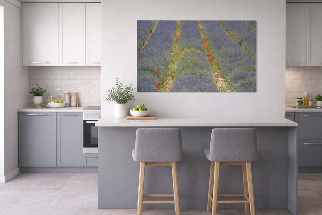 Besonders in der Küche entfaltet „Lavendelstraße“ eine wunderbare Wirkung. Es bringt Frische in den Raum und schafft eine freundliche, mediterrane Umgebung. Die hochwertige Umsetzung auf Acrylglas oder Leinwand verstärkt die Brillanz der Rot- und Violetttöne. Auf Alu-Dibond wirkt das Motiv modern und besticht durch eine matte, reflexionsfreie Oberfläche, die auch bei direktem Lichteinfall in der Küche perfekt zur Geltung kommt. Ein Kunstwerk, das die Lebensfreude des Südens einfängt und jeden Tag ein Stück Urlaubsgefühl in Ihr Zuhause bringt.
