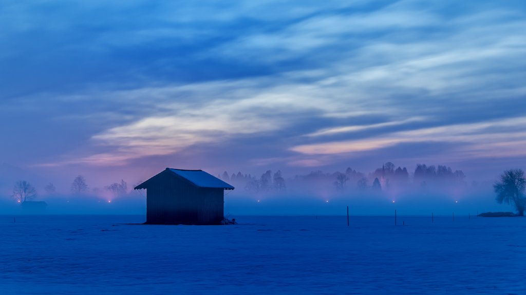 Motiv: Einsame Hütte in verschneiter Landschaft bei Dämmerung mit Bodennebel.