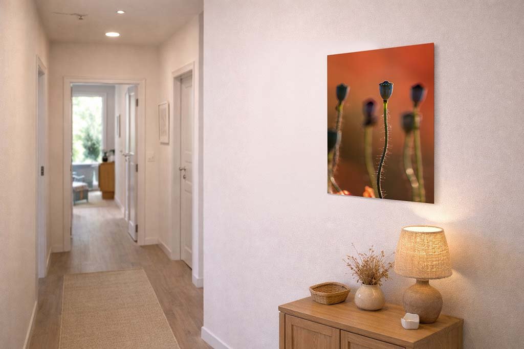 In einem Hausflur platziert, fungiert dieses Bild als eleganter Willkommensgruß. Die vertikale Ausrichtung der Kapseln harmoniert perfekt mit der Raumhöhe und verleiht dem Eingangsbereich eine strukturierte, beruhigende Atmosphäre. Auf Acrylglas kommen die feinen Details und die Lichtreflexe besonders brillant zur Geltung. Eine Leinwand unterstreicht die organische Anmutung des Motivs, während Alu-Dibond eine moderne, matte Optik bietet, die auch bei direktem Lichteinfall im Flur reflexionsfrei bleibt. Ein exklusives Werk für Liebhaber subtiler Naturästhetik.