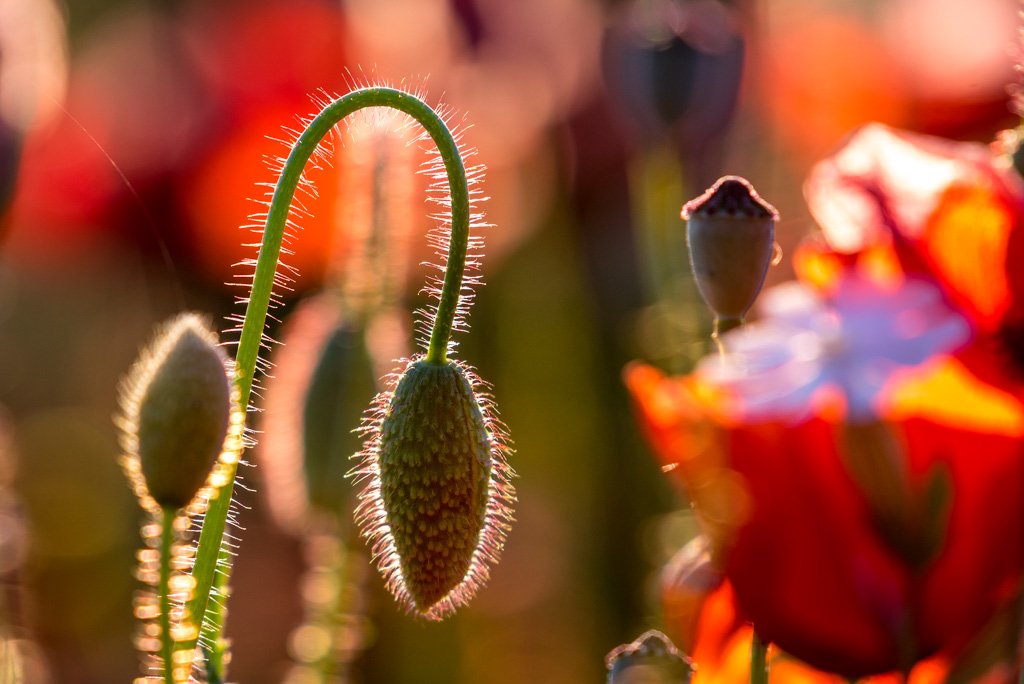 Dieses Bild ist eine Hommage an die feinen Strukturen, die das bloße Auge oft übersieht. „Mohnflaum“ fängt den Moment ein, in dem die tiefstehende Sonne die Konturen einer Mohnkapsel perfekt nachzeichnet. Die Brillanz des Lichts und die Schärfe der winzigen Härchen bilden einen reizvollen Kontrast zur malerischen Unschärfe der roten Blüten im Hintergrund.