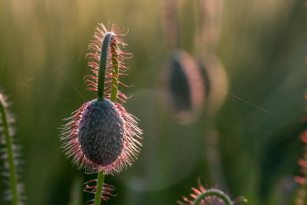 Motiv: Mohnkapsel mit feinen Härchen und Spinnweben in Makro-Ansicht.