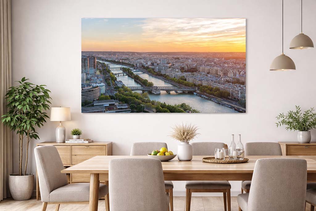 Besonders in einem Esszimmer entfaltet das Wandbild „Paris am Abend“ eine einladende Wirkung. Es dient als perfekter Gesprächsstoff bei Tisch und vergrößert den Raum optisch durch seine weite Perspektive. Auf Acrylglas wirkt die Leuchtkraft des Sonnenuntergangs besonders brillant. Auf Alu-Dibond überzeugt das Panorama durch seine edle, reflexionsfreie Oberfläche. Verschönern Sie Ihre Wände mit diesem stimmungsvollen Blick auf die Dächer von Paris.