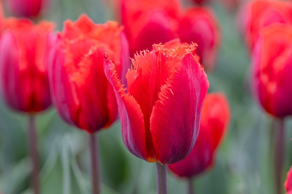 Dieses Wandbild feiert die filigrane Schönheit der Natur. Die Fotografie zeigt ein Tulpenfeld in voller Blüte. Im Fokus stehen die markanten, gefransten Blütenblätter, die dem Motiv eine fast samtige Textur verleihen. Die geringe Schärfentiefe lässt die übrigen Blumen in einem harmonischen Bokeh aus Rot- und Grüntönen verschwimmen. Dies erzeugt eine beeindruckende optische Tiefe und stellt die Eleganz der floralen Formen in den Mittelpunkt.