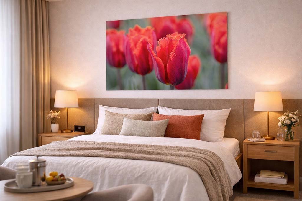 Besonders im Schlafzimmer schaffen die „Roten Tulpen“ eine behagliche und zugleich belebende Atmosphäre. Sie wirken wie ein Fenster zu einem blühenden Garten und sorgen für einen freundlichen Start in den Tag. Die hochwertige Umsetzung auf Acrylglas verstärkt die Leuchtkraft der Farben und die Brillanz des Lichts. Auf Alu-Dibond wirkt das Motiv besonders modern und besticht durch eine edle, matte Oberfläche ohne Reflexionen. Ein exklusives Werk für Liebhaber der modernen Pflanzenfotografie.