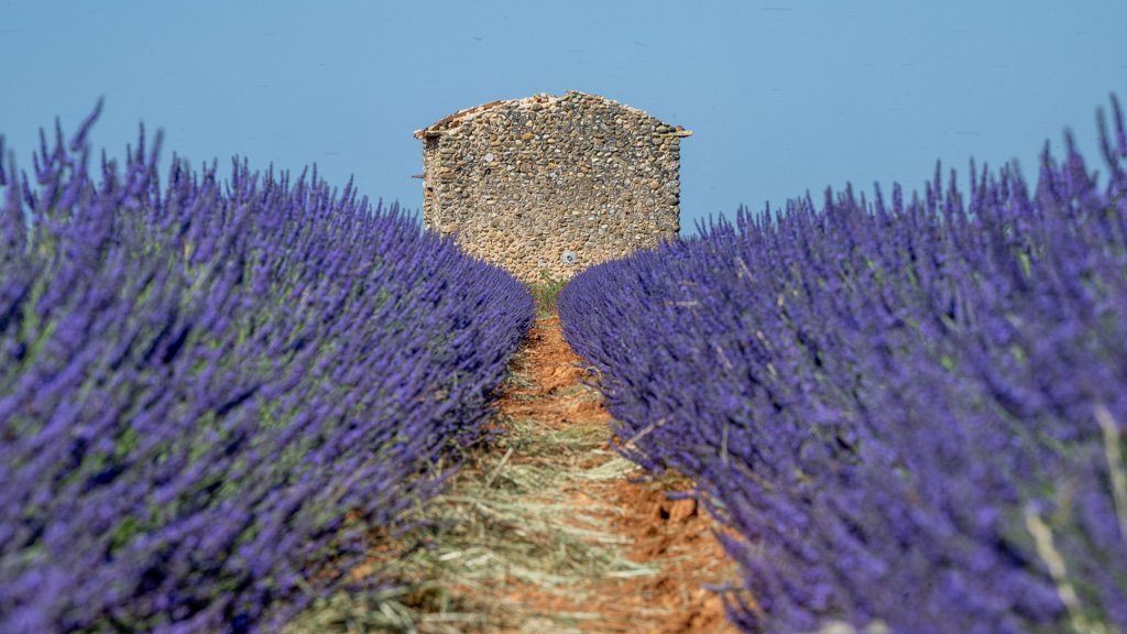 • Motiv: Historische Steinhütte inmitten von Lavendelreihen.