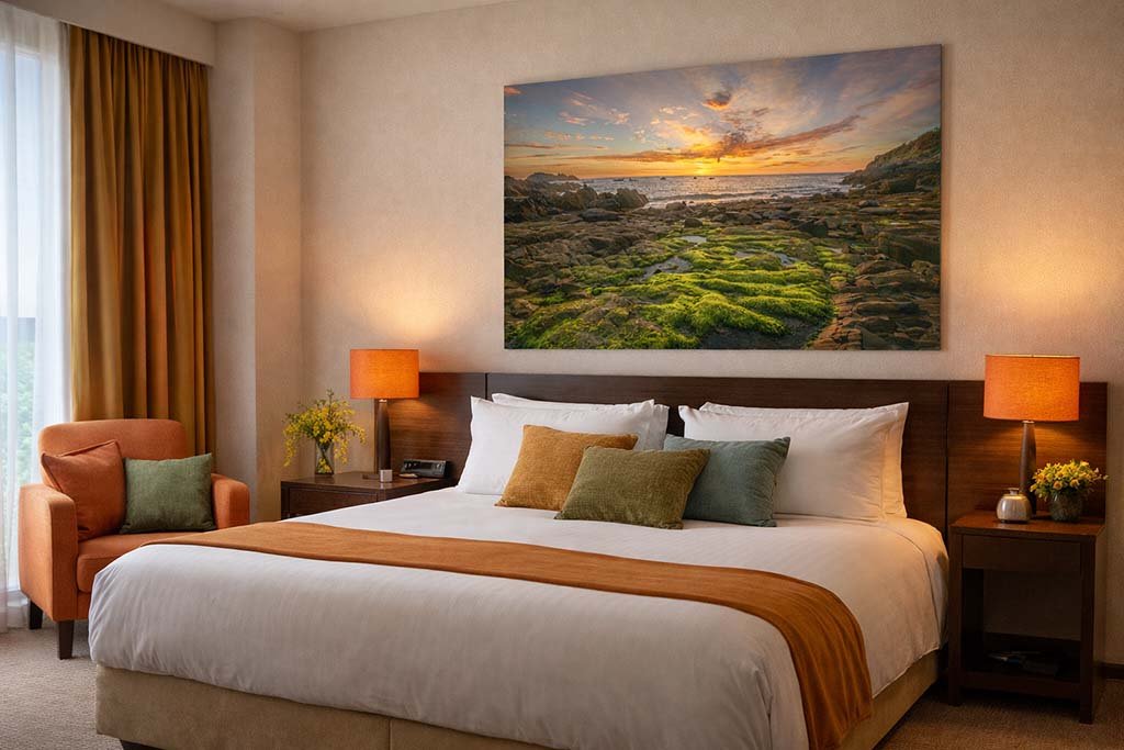 Besonders markant ist der Vordergrund: Die mit leuchtend grünen Algen bewachsenen Felsen bilden einen starken, komplementären Kontrast zum warmen Licht des Horizonts. Diese lebendige Farbkombination verleiht dem Raum eine spürbare Frische und Wärme. Das Wandbild „Sonnenaufgang“ eignet sich hervorragend für Bereiche, in denen eine einladende und positive Grundstimmung erzeugt werden soll – perfekt für ein exklusives Hotelzimmer oder den privaten Ruhebereich. Ein Stück Fotokunst, das die unberührte Schönheit des Meeres bei Tagesanbruch zelebriert.