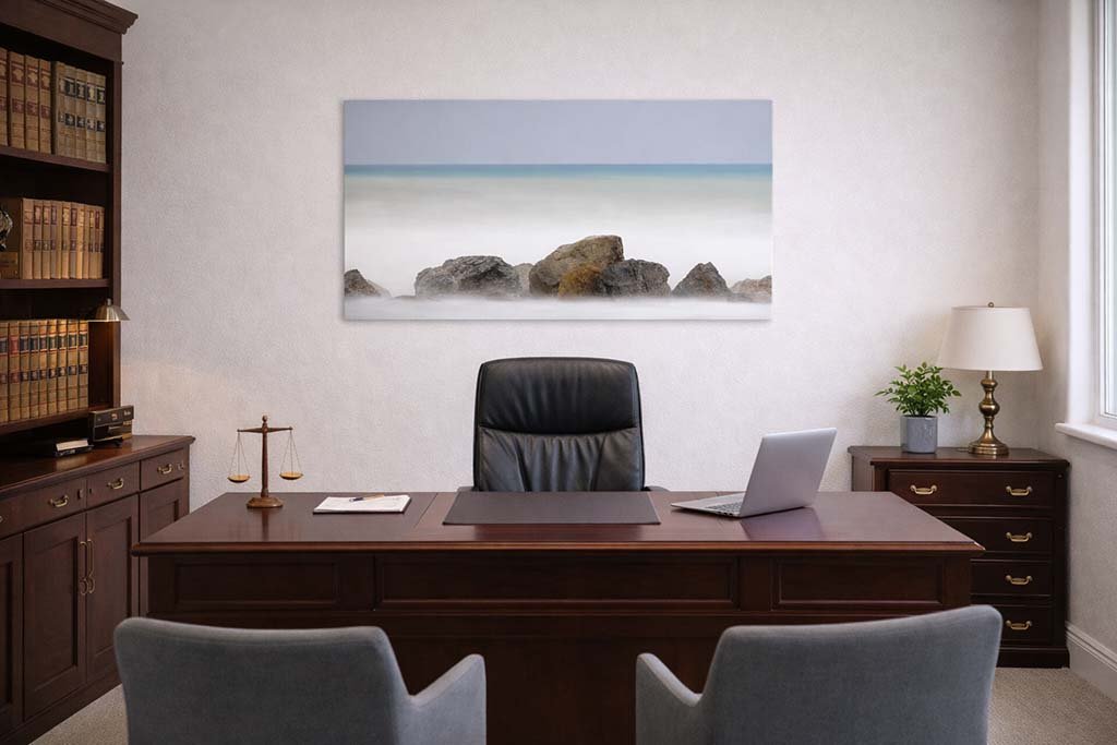 Setzen Sie ein Zeichen von Beständigkeit und Klarheit. Das Wandbild „Stonewater“ im Format 2:1 besticht durch seine minimalistische Kraft und zeigt die Ruhe massiver Felsen in einer sanften Brandung. Ein ideales Panorama-Werk für die repräsentative Wandgestaltung in einer Anwaltskanzlei oder in Konferenzräumen.