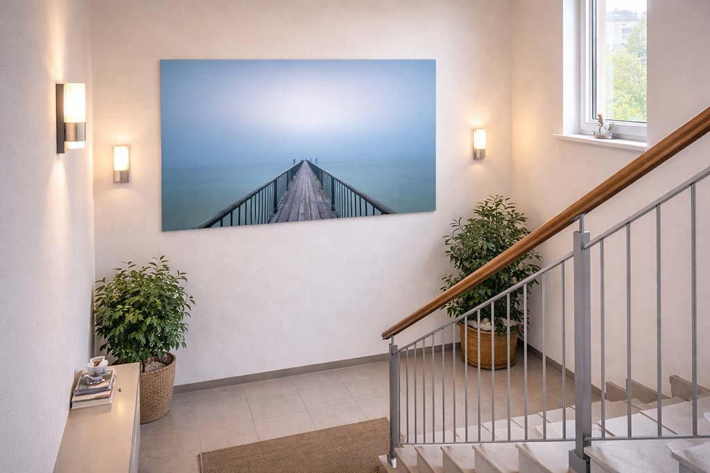 Lassen Sie den Alltag hinter sich und folgen Sie dem Pfad zum Licht. Dieses Wandbild „To the Light“ zeigt einen schier endlosen Steg, der harmonisch in eine neblige Unendlichkeit führt. Die kühle, bläuliche Farbgebung kombiniert mit der hellen Lichtquelle im Zentrum erzeugt eine fast spirituelle Klarheit. Im modernen 16:9 Breitbildformat entfaltet die Linienführung eine starke perspektivische Wirkung, die besonders in hohen oder schmalen Durchgangsbereichen wie Treppenhäusern eine beeindruckende Dynamik entwickelt.