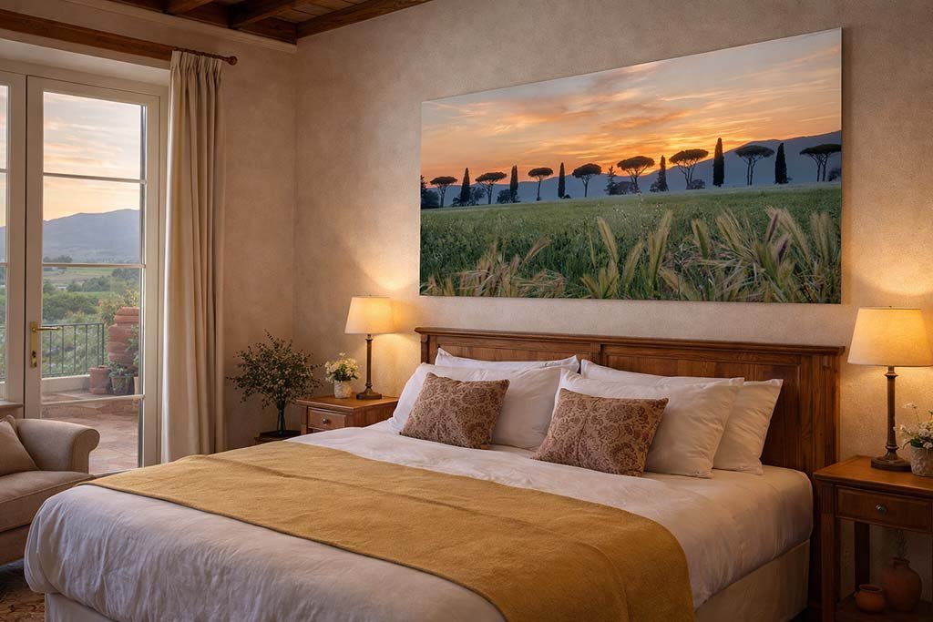 Diese harmonische Verbindung aus Struktur und Farbe macht das Wandbild zu einem idealen Rückzugsort für das Auge. Besonders im Schlafzimmer entfaltet die „Toskanische Allee“ ihre volle beruhigende Wirkung und lädt dazu ein, den Tag mit einem Blick in die weite Ferne Italiens abzuschließen. Ein exklusives Stück Fotokunst, das die zeitlose Ästhetik und die warme Seele der Toskana in Ihr persönliches Ambiente bringt.