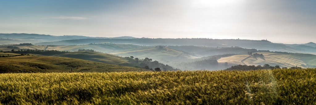 Motiv: Weites Panorama der Toskana mit Getreidefeld und Hügellandschaft.