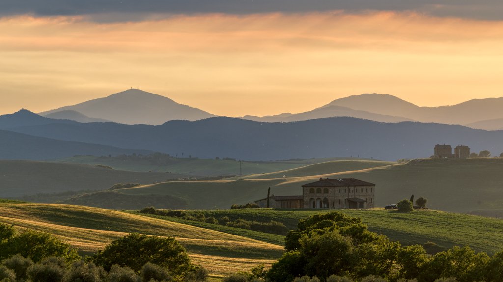 Motiv: Abendliche Hügellandschaft in der Toskana mit Landhaus und Bergpanorama.