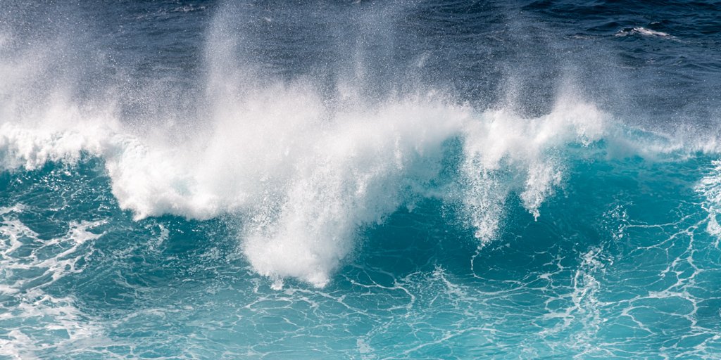 Motiv: Nahaufnahme einer brechenden Meereswelle mit Gischt in Türkis-Tönen.