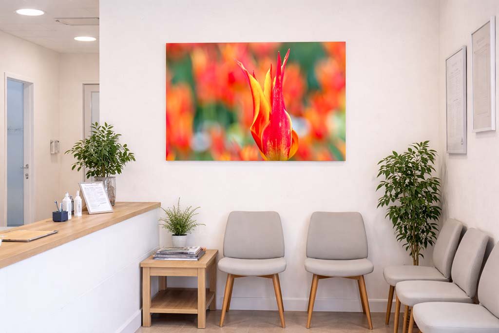Im Empfang einer Arztpraxis setzt dieses Wandbild einen optimistischen und lebendigen Akzent. Es signalisiert Energie und Aufmerksamkeit und sorgt für eine freundliche Umgebung, in der sich Patienten sofort willkommen fühlen. Auf Acrylglas gewinnen die flammenden Farben an spektakulärer Brillanz und Tiefe. Die Umsetzung auf Leinwand unterstreicht den künstlerischen Charakter des Makros, während Alu-Dibond eine edle, matte Oberfläche bietet, die störende Lichtreflexe im Praxisalltag minimiert.