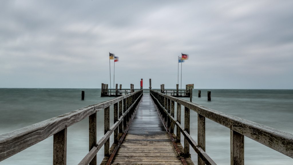 Motiv: Seebrücke an der Ostsee bei stürmischem Wetter und bedecktem Himmel.