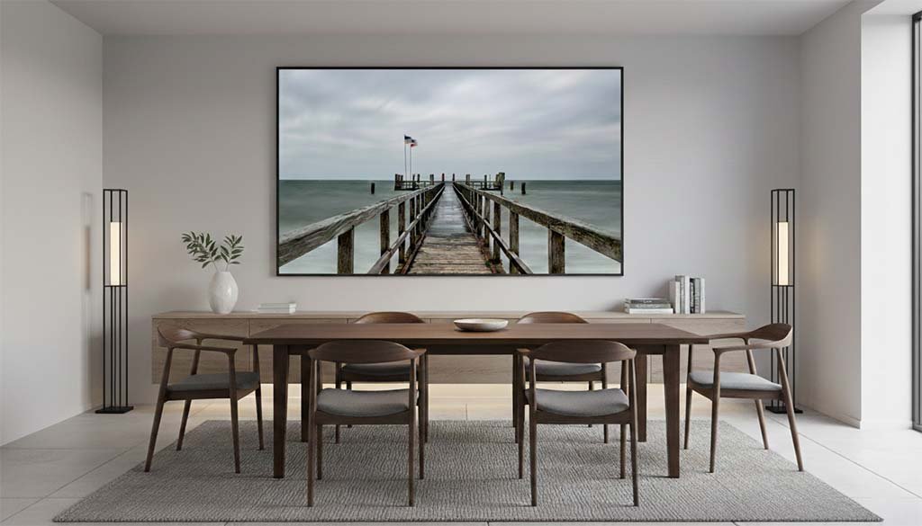 Spüren Sie die raue Brise und die Freiheit der Küste. Das Wandbild „Wind von links“ im weiten 16:9 Panorama-Format fängt die melancholische Schönheit eines stürmischen Tages am Meer ein. Die hölzerne Seebrücke führt den Blick des Betrachters direkt hinaus in das neblige Grau des Ozeans, während die wehenden Flaggen die Dynamik des Windes spürbar machen – ein minimalistisches Statement für maritime Sehnsucht.