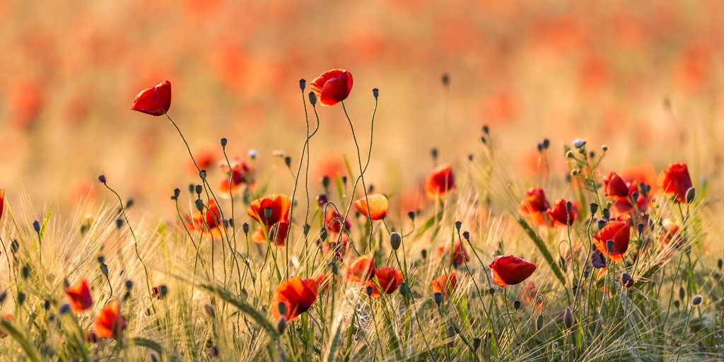 Motiv: Panorama-Aufnahme einer Mohnwiese im warmen Abendlicht.