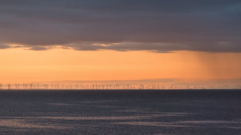 Motiv: Windpark-Silhouetten über dem Meer während der goldenen Stunde.
