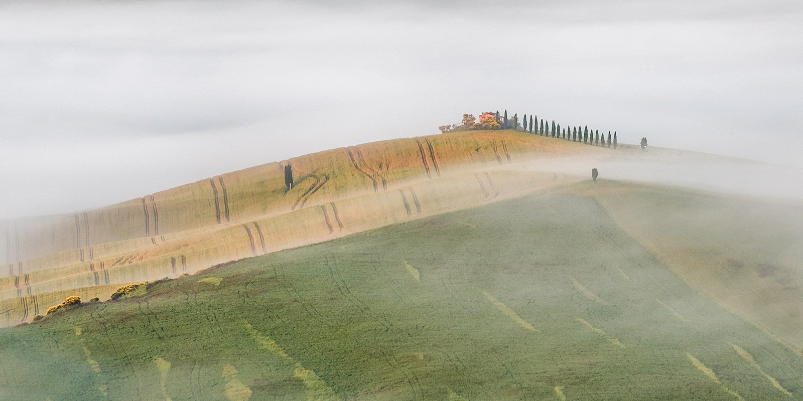 Die Serie „Toscana nella nebbia“ entstand an einem einzigen außergewöhnlichen Morgen im Mai 2018. Während viele Fotografen auf spektakuläre Sonnenuntergänge setzen, lebt diese Serie von Zurückhaltung, Reduktion und Lichtstimmung. Der Nebel strukturiert die Hügel neu und lenkt den Blick gezielt auf Details – von den berühmten Zypressen bei San Quirico d’Orcia bis zu den charakteristischen Gehöften der Region.